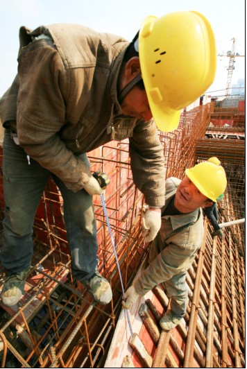 (圖為一體化生物反應(yīng)池建設(shè)工地上工人們?cè)?span lang="EN-US">7米多高的腳架上搭建混凝土澆筑夾板。)