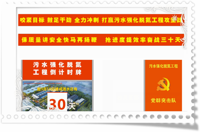 目前,在污水強化脫氮工程現(xiàn)場明顯位置,已樹立工程沖刺倒計時牌。公司要求,各級領導干部人員必須清醒認識到形勢嚴峻,要在最后1個月的時間里拿出更大的干勁全面沖刺,確保工程建設任務的按期完成。同時,公司黨支部錢書記也特別強調,要充分發(fā)揚黨員干部先鋒模范帶頭作用,使廣大黨員平常時候看得出來、關鍵時刻站得出來、危急關頭豁得出去,要將把黨的政治優(yōu)勢轉化為項目推進優(yōu)勢,把黨建力量凝聚為奮斗合力,確保工程順利建成通水。